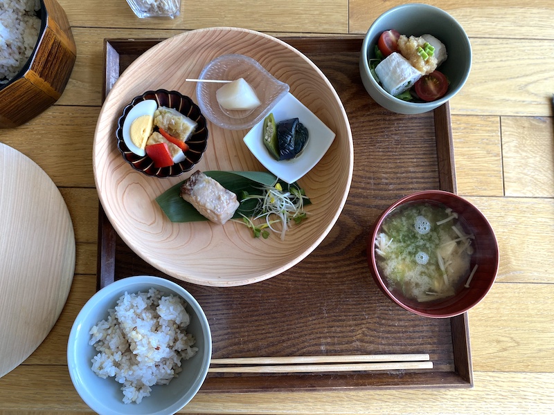↑左から時計回りに「ゆめみどりのねぎ蒸し・季節のフルーツ・茄子の揚げびたし・鮮魚の醤油こうじ焼き」。