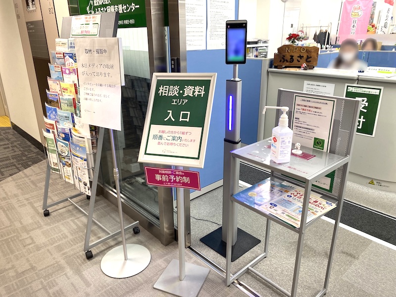 体温を測るモニターと消毒液が設置してあります。(※訪問当時)