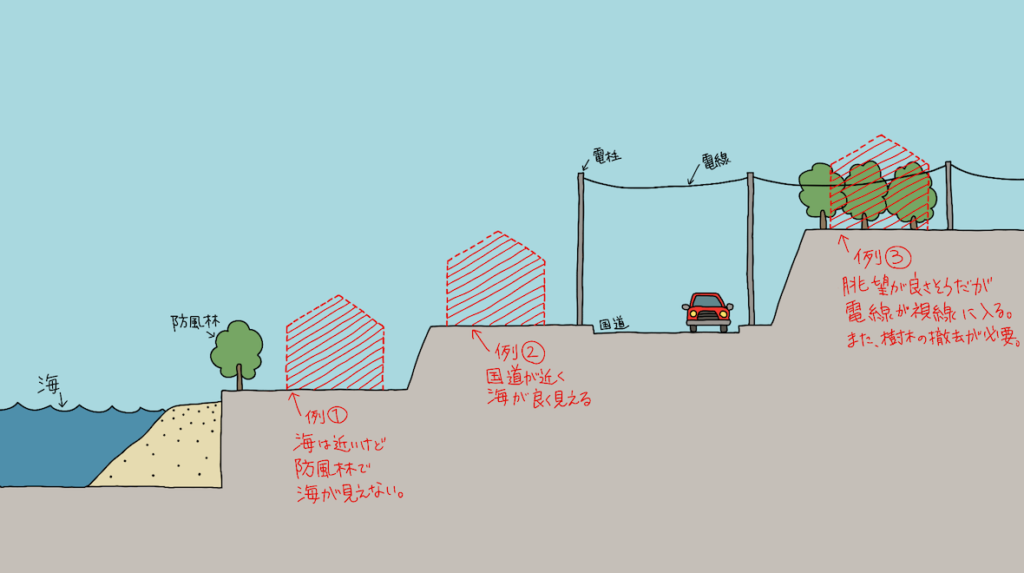 候補地はだいたい上の図のような感じになっていて、防風林や電線などで眺望が遮られてたり、整地が必要だったりで、良いなと思ったのは2つほどでした。