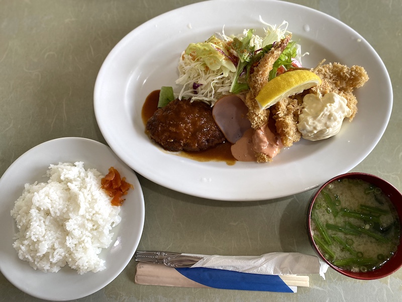 ↑肉々しいハンバーグとエビフライがライスによく合い、食後の満足感がハンパない。